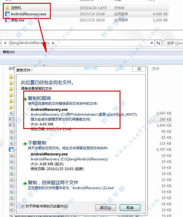 2、在软件关闭的情况下,回到软件安装包,将注册机文件和AndroidRecovery.exe文件复制到软件安装路径下,并覆盖替换原文件,选择复制和替换即可