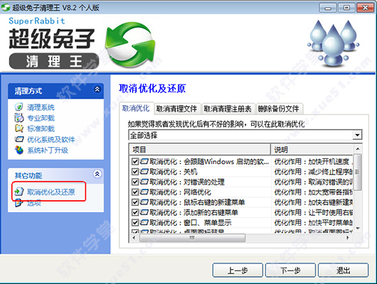 4、“取消优化及还原”如果你有什么操作上的错误或者删错了东西,你就可以在这里找到你原来的东西。