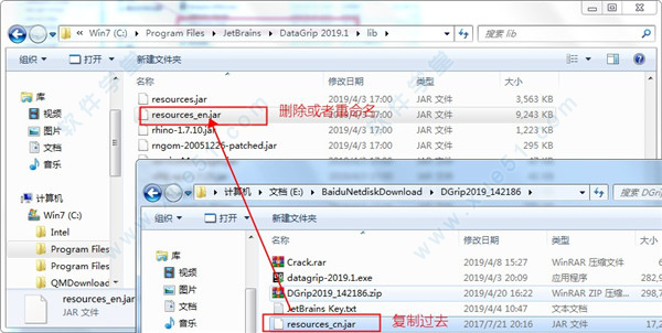 4、汉化需要到的“lib”文件夹,将原来的resources_en.jar英文版文件删除,然后将汉化补丁“resources_cn.jar”复制入同一个目录下,默认安装目录为C:\Program Files\JetBrains\DataGrip 2019.1\lib