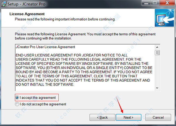 2、选择“I accept the agreement”同意许可证协议,协议内容自行决定是否浏览,点击“Next”继续安装;