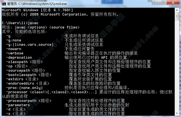 5、设置成功后打开cmd命令行,输入命令“javac”,如下图所示表示环境变量配置成功。