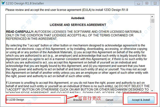 1、下载解压,得到32位和64位的autodesk 123d软件,自行安装和系统相配的版本,安装路径可按默认方式也可自行设置,点击“accept&install”开始安装;