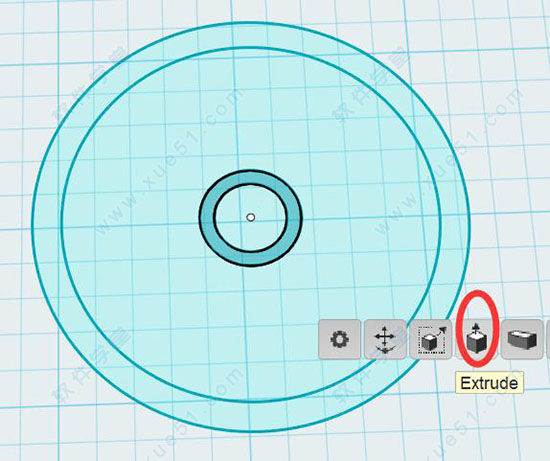 4、分别选择内外两侧的大小圆环面(一定要选面),然后此时在弹出的齿轮状工具中点击选择extrude(直推)指令,