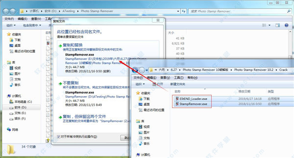 2、然后将Crack文件夹下的“ElitEND_Loader.exe”与“StampRemover.exe”这两个破解补丁复制到上一步中打开的软件位置,在出现的提示中选择复制和替换这一项。