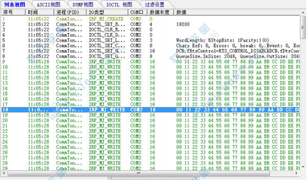 当前 IOCTLs 过滤数据放入该视图;内容包括: 目标进程、COM 号、IOCTLs 名称、数据。