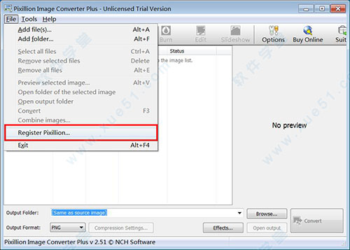 4、接着运行软件。在主界面的菜单栏File下,选择Register Pixillion进行注册;