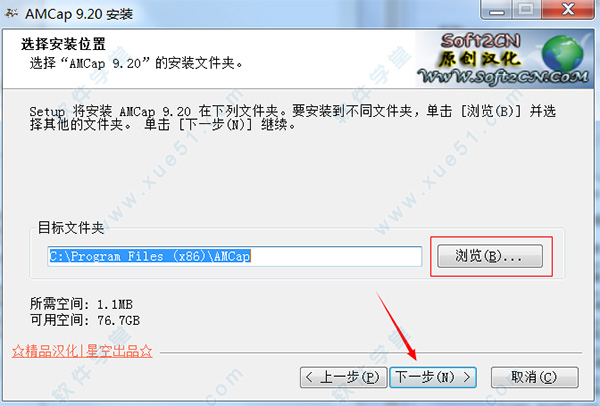 4、自定义软件安装位置,默认安装路径为“C:Program Files (x86)AMCap”,点击“下一步”进行安装;