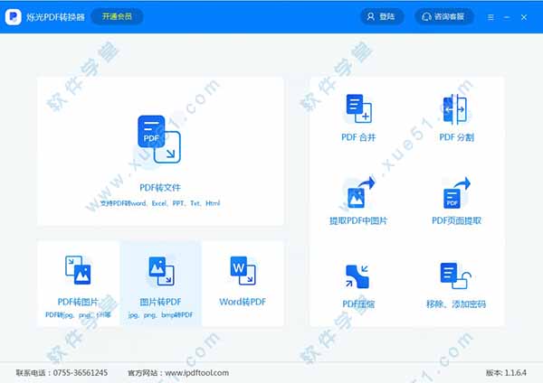 烁光PDF转换器是一款功能丰富的PDF转换软件,集PDF转文件,PDF转图片,图片转PDF,Word转PDF,PDF合并,PDF分割,提取PDF中图片,PDF页面提取,PDF压缩,移除、添加密码等诸多功能于一体,可以分割合并pdf、压缩pdf文件、获取pdf文件图片、pdf解除密码以及多种电子书格式转换等,还可批量转换文档,实现一键轻松转换!它可以帮助你将pdf文件转换为word、PPT、excel、PNG等格式,支持双向转换,使用简单高效,也可以一次性将多个PDF文件转成Microsoft Word,Excel,PowerPoint,PNG,JPEG图片格式等。另外,软件支持移除PDF文档密码限制,如PDF无法打印,PDF无法复制等都可以解决,支持
