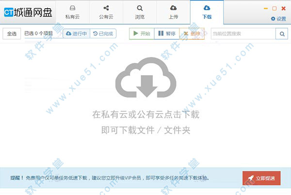 城通网盘客户端是一款针对电脑系统而设计制作的资源下载、上传软件,支持数据包、视频、文本、音频、图片等文件上传/下载,拥有私有云、公有云、浏览、上传和下载五大栏目,能够更好的帮助用户管理网盘资源,可以让用户拥有更快的上传和下载速度,以及更方便的分享功能,非常方便。它具备一般网盘提供的功能,并且功能更强大, 提供免费400GB公有云空间便于大家分享资源,私有云空间便于存储个人隐私性东西,专用下载通道,专享离线下载,极速网页分享、直连下载,在线打包、在线解压,FTP文件管理上传下载,Webdav文件管理上传下载等,给用户在使用方面带来了便利。小编给大家带来了