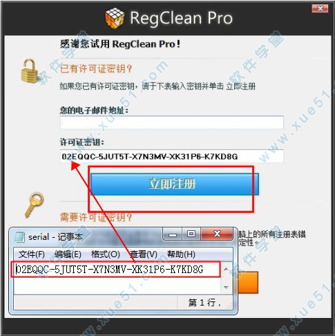 4、进入软件注册界面,然后回到软件安装包打开serial文件,将文件内注册码02EQQC-5JUT5T-X7N3MV-XK31P6-K7KD8G复制到软件注册界面许可证密钥方框内,电子邮件地址随意填写,然后点击立即注册即可