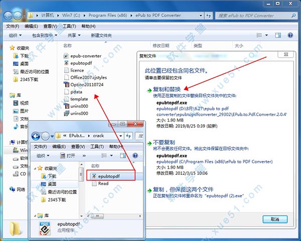 1、打开crack文件夹,将破解补丁epubtopdf.exe文件复制到软件安装路径下,并覆盖替换原文件,选择复制和替换即可
