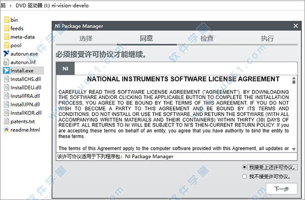 2、首先用虚拟机加载ni-vision-development-module_19.0.0_offline.iso镜像文件,或用winrar解压,然后双击运行Install.exe程序进行软件安装,弹出界面进入安装向导界面,点击我接受上述许可协议,然后点击下一步继续安装