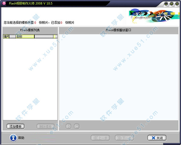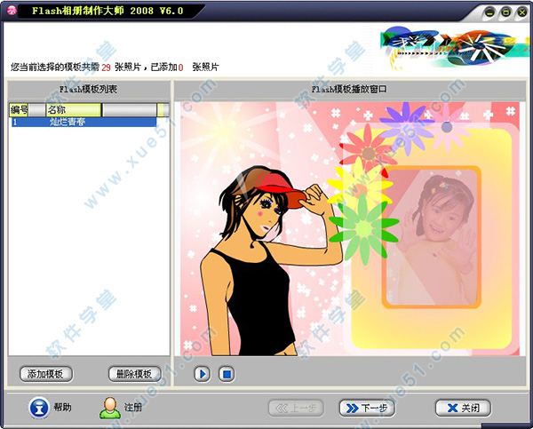 1、点击“添加模板”按钮,在弹出的打开文件对话框中选中我们给您提供的Flash模板后点击“打开”按钮,即可把模板添加到软件中。您可以预览模板的效果,选中模板后点击“下一步”。