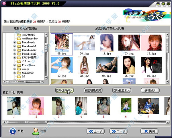 选择您的照片所在的路径后所有照片都会在软件上显示出来,您可以把要的照片拖放到下面“模板中相片列表”的相应位置,也可以点击“自动选择照片”按钮,软件会自动选择照片到模板中。接下来您可以点击“自动裁剪照片”软件会自动裁剪好所有照片,也可以对照片一张张地手工进行裁剪编辑。处理好照片后,再点击“下一步”按钮继续。
