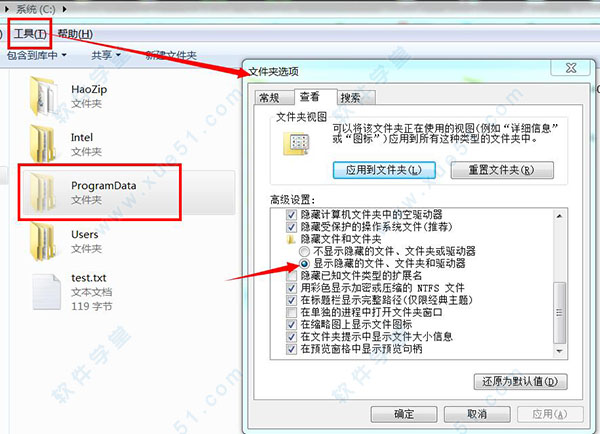 1、首先打开C盘,选择点击“工具”按键,选择“文件夹选项”,勾选“显示隐藏文件”,这样就会出现一个“programData”文件夹