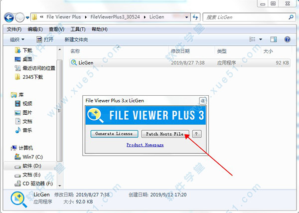 2、软件安装完成后,先不要运行打开软件,回到软件安装包打开LicGen文件夹,双击运行LicGen.exe破解程序,弹出界面,点击Patch Hosts File屏蔽hosts文件