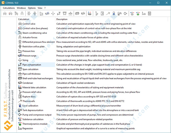 阀门选型软件Conval 10是一款非常专业的阀门选型软件,在原软件基础上进行了更新和升级,比如改进占用网络许可证的行为,对稳定性问题的微小改进和修复;控制阀修改了闪蒸条件下阀门的可靠性分析,修复了稳定性问题;差压流量元件修复了创建参数图时的稳定性问题;限制孔板修改计算最小板厚;泄压阀对稳定性问题的微小改进和修复等等,可以更好的为设计人员提高工作效率。与同类软件相比,Conval 10拥有出色的优点,软件使用成熟的工艺技术对Camseal球体和阀座进行表面硬化、研磨和抛光处理,极高密度的涂层和精确的抛光技术使得球体和阀座密封实现气密级密封,即使是在安装时和安装后,密封处也能保持气密。本软件拥有多个程序模块,包括阀门、节流元件、测量仪器、管道系统计算、换热衷器、安全工程等,并提供了精确的计算选项,可以使用根据DIN,VDI,VDMA EN / ISO标准或ISA,ASME,API等的经验证的程序作为基础,能够更轻松的用于设计,优化和规划阀门。