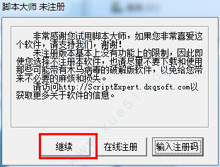 1、在本站下载好软件安装包,该安装包已经是绿色的,软件无需安装,双击运行“ScriptExpert.exe”,提示注册页面,无需注册也可使用该软件,点击“继续”。