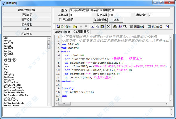 脚本大师7.5英文名Script Expert,是一款现在非常火热的游戏工具制作软件。它拥有Lua脚本驱动,另外还外接插件模式,可以让游戏制作的难度大大的降低,计算是业余爱好者也能够制作出非常好的游戏工具。有了它你可以随意制作出对鼠标、键盘控制的脚本,也可以制作机器人脚本,帮助你学子喜、工作、玩游戏等,让效率事半功倍,另外还支持条件判断、循环、常量、变量、函数调用、表达式计算等高级功能。有需要朋友可以来本站下载脚本大师7.5哦!