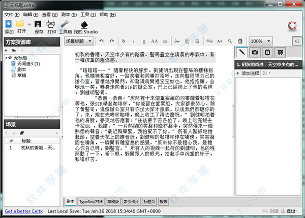 celtx据说是目前最专业的一款剧本编辑软件,用户可以通过使用这款软件来编辑各种类型的剧本如电影剧本、戏剧剧本、广播剧剧本等。几乎提供了一份剧本在创作过程中需要到的所有元素场景、角色、对话、动作等都可以通过软件来选择添加,所以使用起来非常简单,哪怕你是第一次使用这个软件,也能很快地达到熟练使用的程度。就算你不是专业的编剧,或者也没有接触过剧本编写方面,只要你有创意有想法,它就能帮你成为一位编剧。