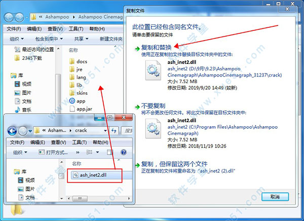 1、打开crack文件夹,将破解补丁ash_inet2.dll文件复制到软件安装路径下,并覆盖替换原文件,选择复制和替换即可激活软件