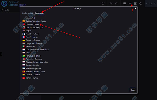 2、运行打开软件,点击设置按钮,然后点击language,选择Chinese-Taiwan中文语言
