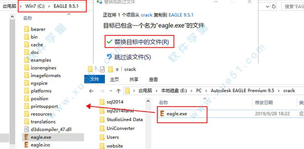 2、安装完成后将破解补丁复制到安装目录下替换原文件即可,默认安装目录为“C:\EAGLE 9.5.1”