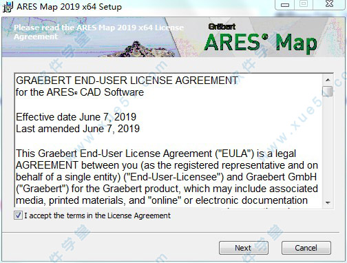 2、然后双击运行ARES_Map_2019_SP2_2019.2.1.3124_978_x64.exe程序进行软件安装,弹出界面,进入安装向导界面,在方框勾选,同意软件相关许可协议,然后点击next进入下一步继续安装