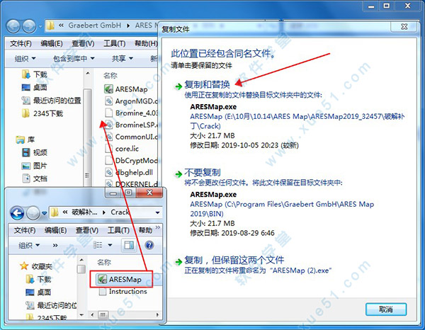 1、进入破解补丁文件,打开Crack文件夹,将破解补丁ARESMap.exe程序文件复制到软件安装路径bin文件下,并覆盖替换原文件,选择复制和替换即可激活软件