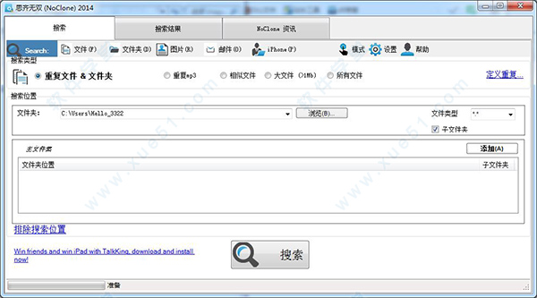 1、设置搜索范围在noclone 注册版主界面中,查看“Select Paths”项目中的“Paths”标签页,在其中的下拉列表中输入搜索路径。大家点击下拉箭头按钮,程序已预置的我的文档及桌面等常用搜索目标,即使用户已更改此类系统文件夹的默认路径,程序也会正确识别其路径。也可以通过“Browse”按钮选出要搜索的目录或驱动器。此后,在“File type”选项中设置文件类型,默认为搜索所有文件。而如果你希望有针对性地搜索电影剪辑、音乐、图像或下载文件,则直接在其下拉列表中选择即可。需要注意的是,程序所预置的各类别文件,仅包含了国际间流行的常用格式,我们在实际应用中需略作改动。例如下载文件类别仅显示有EXE与ZIP格式,我们需手动添加在国内大行其道的RAR格式。