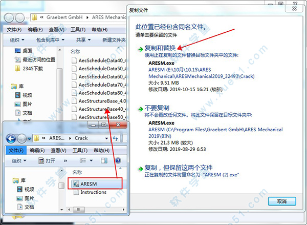 1、打开Crack文件夹,将破解补丁ARESM.exe文件复制到软件安装路径下,并覆盖替换原文件,选择复制和替换即可激活软件