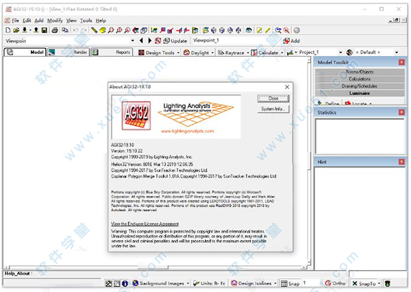 agi32是一款照明工程软件,它的全称为Lighting Analysts agi32,可以进行日光计算分析,并且可以设置不同的天气类型、场地的位置即经纬度、日期、时间等等,一旦日光分析结果计算完毕,渲染的图片可以以一定的频率按序播放,这样很清楚地了解某一个时间段里日光对建筑的影响。它可以同时支持实体模和面模的导入,同时使用范围更广,无论是室内还是室外的场景都适用。软件提供了照明建模、计算和渲染等功能,支持正常直接计算和安全计算模式,可以精确地计算出照度数据,并且可以对亮度分布情况进行渲染操作,除此之外,还可以让你的照片设计作品呈现出速真的效果图。