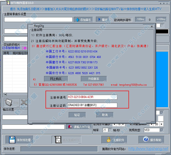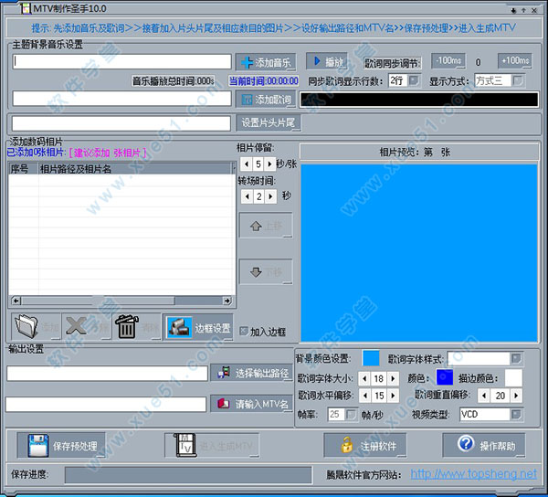 MTV制作圣手破解版下载,内置破解补丁文件可以激活注册软件,解锁功能限制,并增加软件免费使用期限时间,用户就可以永久免费、无功能限制使用,且不需要收费使用,想用多久就用多久,非常方便。MTV制作圣手多媒体视频制作软件可以将相片、文字、音乐转换生成个性化MTV,操作简单,首先添加音乐及歌词,接着加入片头片尾及相应数目的图片,然后设好输出路径和MTV名,接下来保存预处理,最后进入生成MTV即可。该软件能够将各种精彩个性相片配上各种转场效果,动感音乐加上同步歌词字幕一次性快速转换生成VCD/SVCD/DVD格式的MTV。