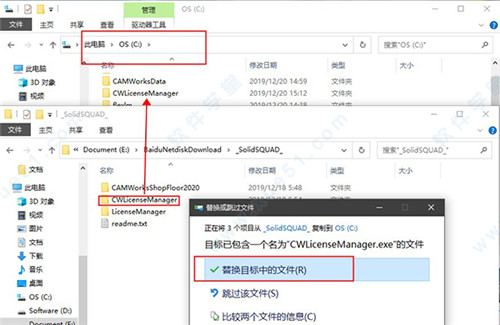 3、这时,同样找到_SolidSQUAD_破解许可文件中CWLicenseManager文件夹进行替换,默认在C盘根目录下。