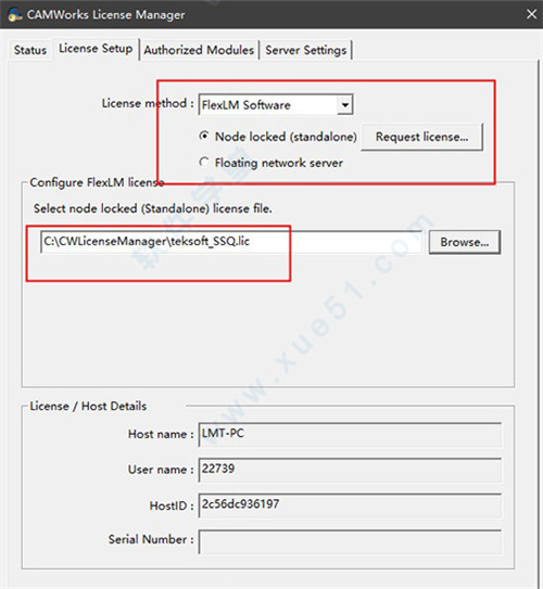4、右键管理员身份运行CAMWorks License Manager,切换至License Setup,License method选择FlexLM Software,浏览指定CWLicenseManager文件夹下的teksoft_SSQ.lic许可证文件。