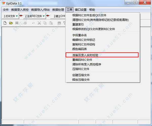 用户在进行数据输出后输出为新的Epidata文件,从文件选择需要进行双录入检验的记录进行输出,在“工具”栏中选择“准备双录入实时检验”进行文件的效验检查,如图所示: