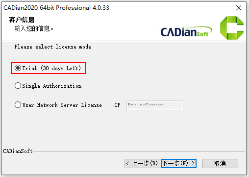 1、下载数据包然后解压,双击CADian2020_4.0.33_64bit_Pro.exe,选择30天试用安装软件