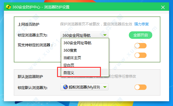 (3)接着在“上网首页防护”中点击“修改主页”,之后选择“自定义”并输入我们想要设置成主页的网址就可以了。