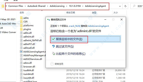 6、把xf-adsk2020-netcrk-win文件夹下的“adlmint.dll”复制到软件许可证管理器目录下;