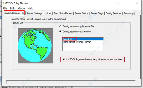10、点击Service/License File标签,打钩LMTOOLS ignores license file path environment variables;