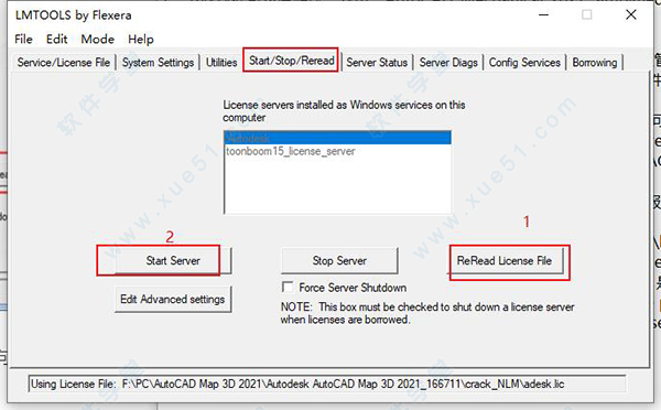 11、点击start/stop/read选项,点击 'rereadlicense file',再点击'start server'启动服务。