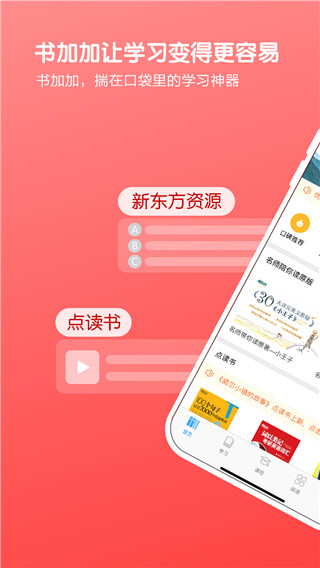 书加加电脑版是一款网络在线学习软件,一键搜索你想要的书籍、资料、视频、课程等学习资源,帮助你快速学习掌握各方面的知识。你来到这里,还为你送上热门推荐、精品课程、点读书、课程市场等丰富学习模块,劳逸结合,当你网上学习的时候看东西眼睛疲劳的时候,你就可以切换以听为主的模式来进行学习,从而缓解视力和精神疲劳,让你想要学习的想法更加强烈。书加加让学习变得更容易,为用户提供新东方正规资源,课程、背单词、英语读物等等这里应有尽有,轻松点读,畅听无忧,随点随听,精彩好书,随时来一点,精讲名著,悦享好文,读原著,品美文,感受语言的魅力!如果你正在改变自己的学习方式,想要提高自身的学习成绩,但是没有好的学习方法,使你非常苦恼,那就来试试这款学习辅助软件吧。