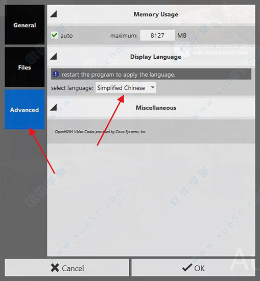 6、安装完成后运行软件,点击advanced——language项选择simplified Chinese