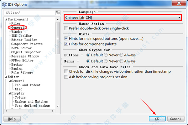 2、在弹出的IDE选项框内,点选左侧Environment下的Desktop(桌面)子选项,将Language设为Chinese [zh_CN];