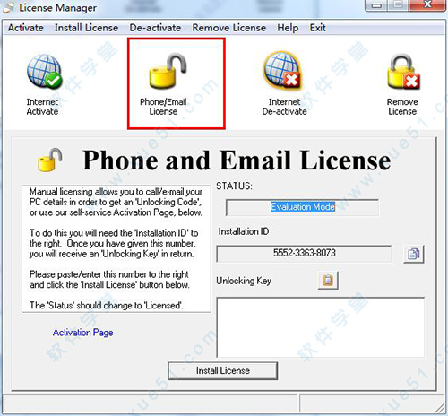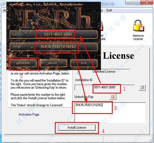 4、将installation ID里的一串号码粘贴到注册机上的第一项“hw-id”然后点击“generate”会生一个密匙,再将密匙粘贴到“unlocking key”再点击“install license”即可,详细的操作过程请参考下图;