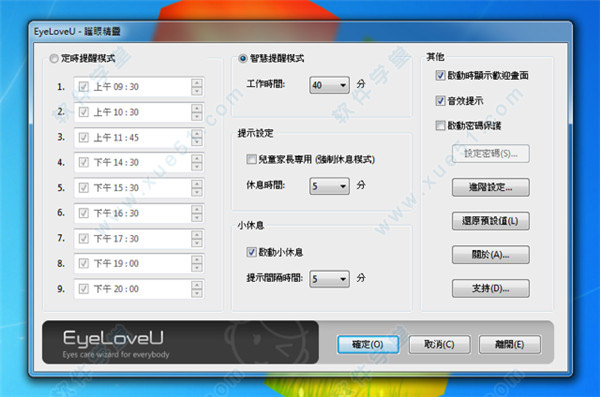 它是一款非常实用的免费眼睛保护软件,可以说是专门为电脑族所设计的护眼程式,适合长期使用电脑的人,可以在使用电脑一段时间后提醒你该让眼睛休息。在电脑前久坐的人,不可避免的身体就会出现一系列问题,眼睛酸痛、流泪,同时也因为久坐导致了颈椎和腰部的疼痛,真的是非常得不偿失;对此,今天特地带来了这么一款软件,它能够定时提醒你注意护眼,除了具备中文介面,功能也是最完整的,主要分为两种提醒模式:定时提醒、智慧提醒,前者可设定不同的提醒时间,后者为工作持续几分钟后进入休息模式。可自定义进行定时提醒,以及智慧提醒模式,智慧提醒是根据你的鼠标和键盘的操作动作来只能判断使用时间,而且只要你的离开电脑停止工作超过五分钟,它就会自动将计时归零 ,内建的人工智慧逻辑,还可以处理模糊的操作计时,并且依据不同的时段,而有不同的提醒画面。除此之外,如果家长想让小孩不过度沉迷于电脑前,可以开启「儿童家长专用」选项设定,强制在时间限制一到锁定萤幕,还能设定密码保护防止EyeLoveU被关闭。