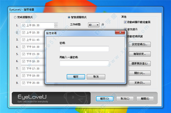 3、不想被小孩任意关闭软件或更改设定吗?可以启动密码保护,在设定密码后除非通过验证,否则就无法修改设定值或关闭护眼程式。