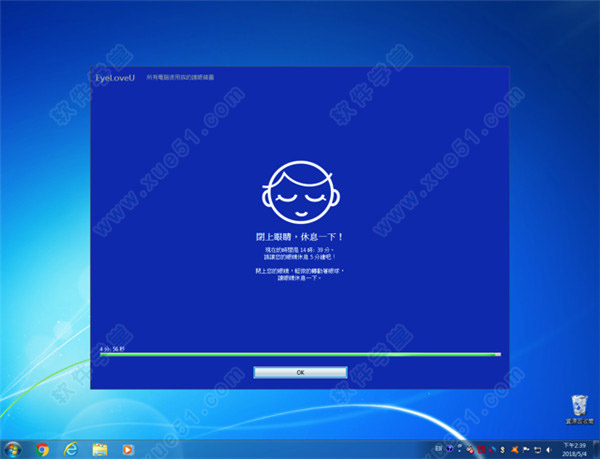 4、下面就是EyeLoveU 在预设的遮蔽70% 范围下跳出来的提醒效果,可以看到每次的文字和颜色都不太一样,下方很贴心地设计了一条进度列,让你知道应该还得休息多长时间。如果你想提前结束休息提醒,亦能点选下方按钮来确认关闭。