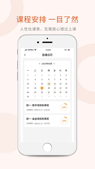 用户预约课程后,可以快速查看课程的内容以及开课时间,即将开课的课程会以课程表效果加以显示、暂未开课的课程以栏目形式往下排。