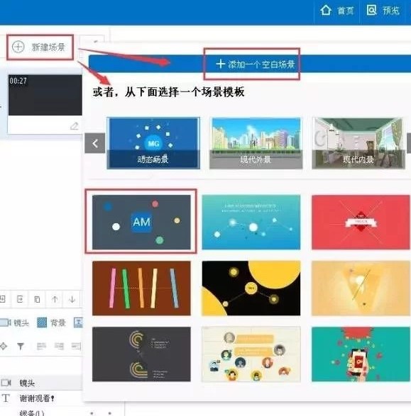 1、新建场景:只需点击左上角“ + 新建场景”按键,就会弹出菜单(如图3),制作者可根据实际情况选择“空白场景”或内置模板。